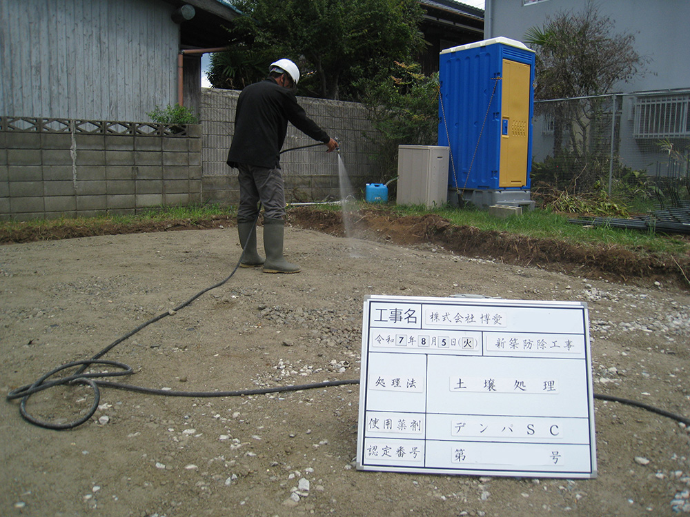 基礎工事に入る前に土の中からシロアリが建物内へ侵入しないように薬剤を直接土壌に散布していきます。博愛の防蟻処理は3段階にわけておこないます。