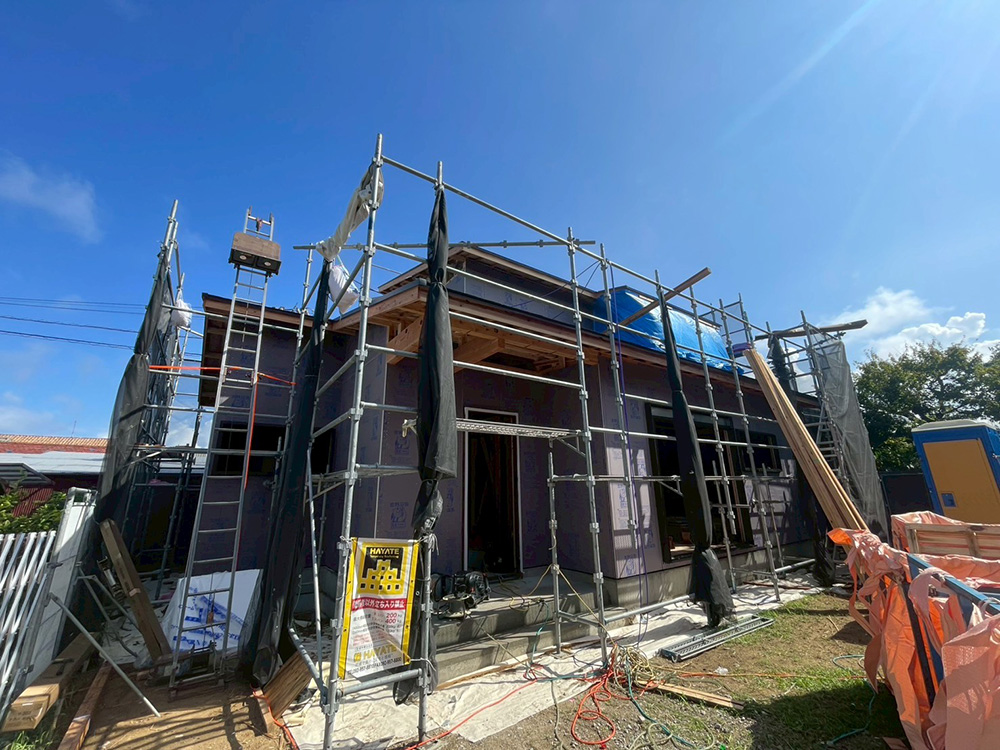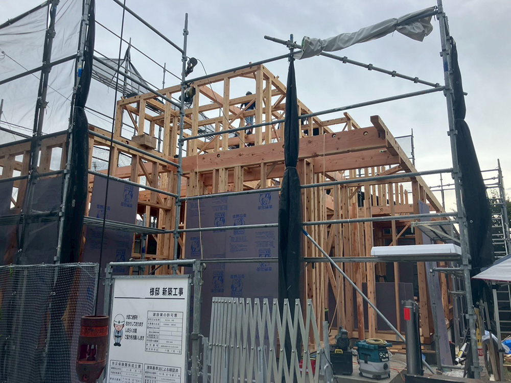 2階建てのO様邸。職人さんたちが手早く組み立て、あっという間に家の形が見えてきました。