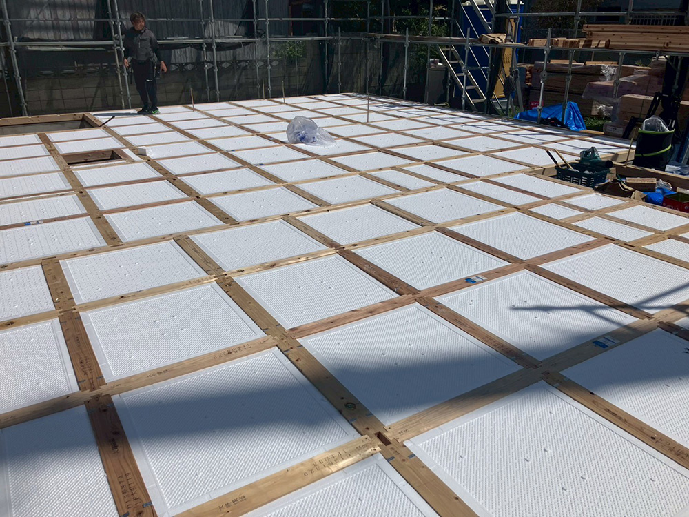 木材を組み終えると床下断熱材を敷いていきます。床下からの湿気を通しにくく、次の工程で張る床合板を湿気から守ります。