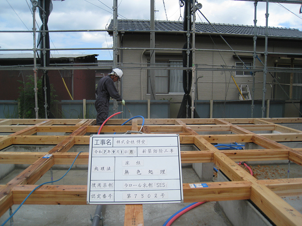 こちらは土台防蟻の様子になります。大引や土台の木材に直接薬剤を散布してシロアリが侵食しないように防ぎます。博愛では2段階目の防蟻処理になります。
