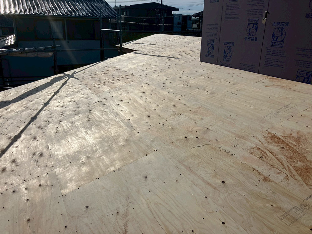 壁面全体には構造用面材を張っていきます。構造用面材で一つの“面”にすることで強度を高め、頑丈なお家をつくっていきます。