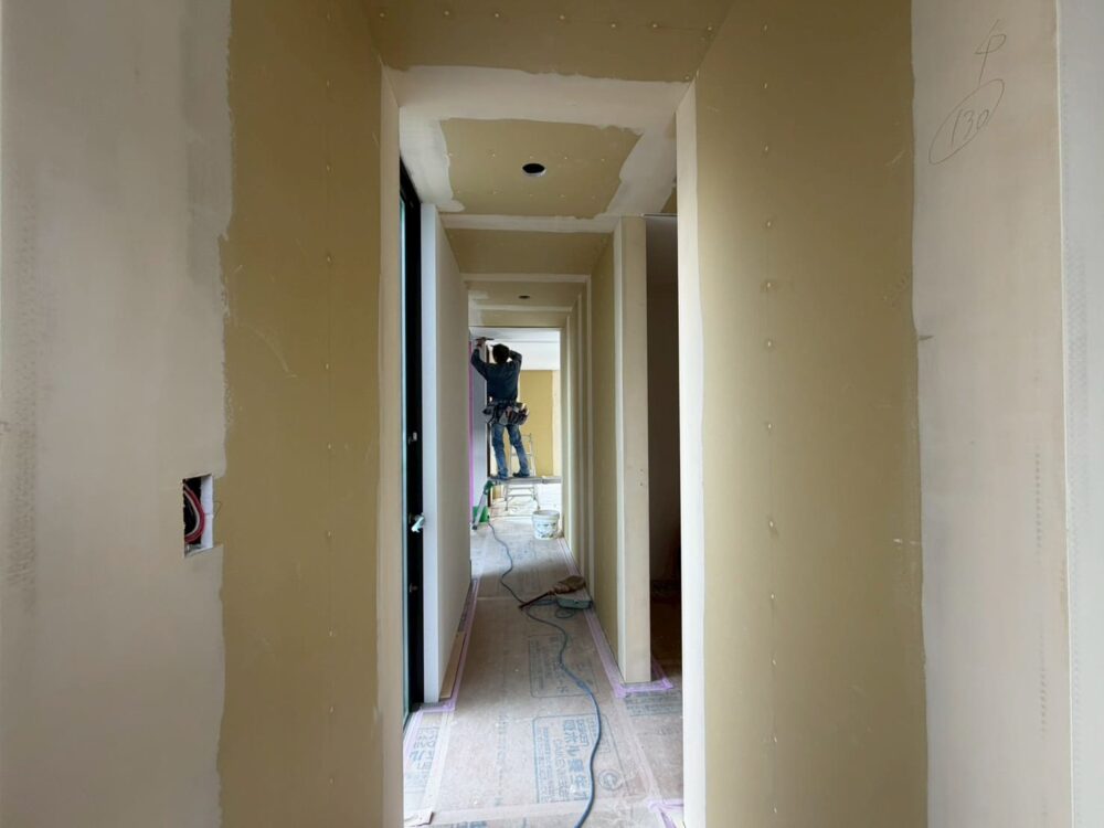 石膏ボード張り後は、ボードとボードの継ぎ目やビスの凹凸を平らにする下地処理がおこなわれました。