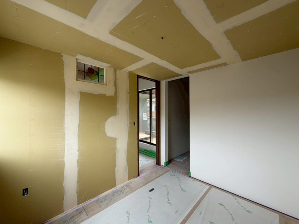 職人さんの丁寧な作業によって、下地処理後のクロスを張る工事まで着々とすすんでいます。