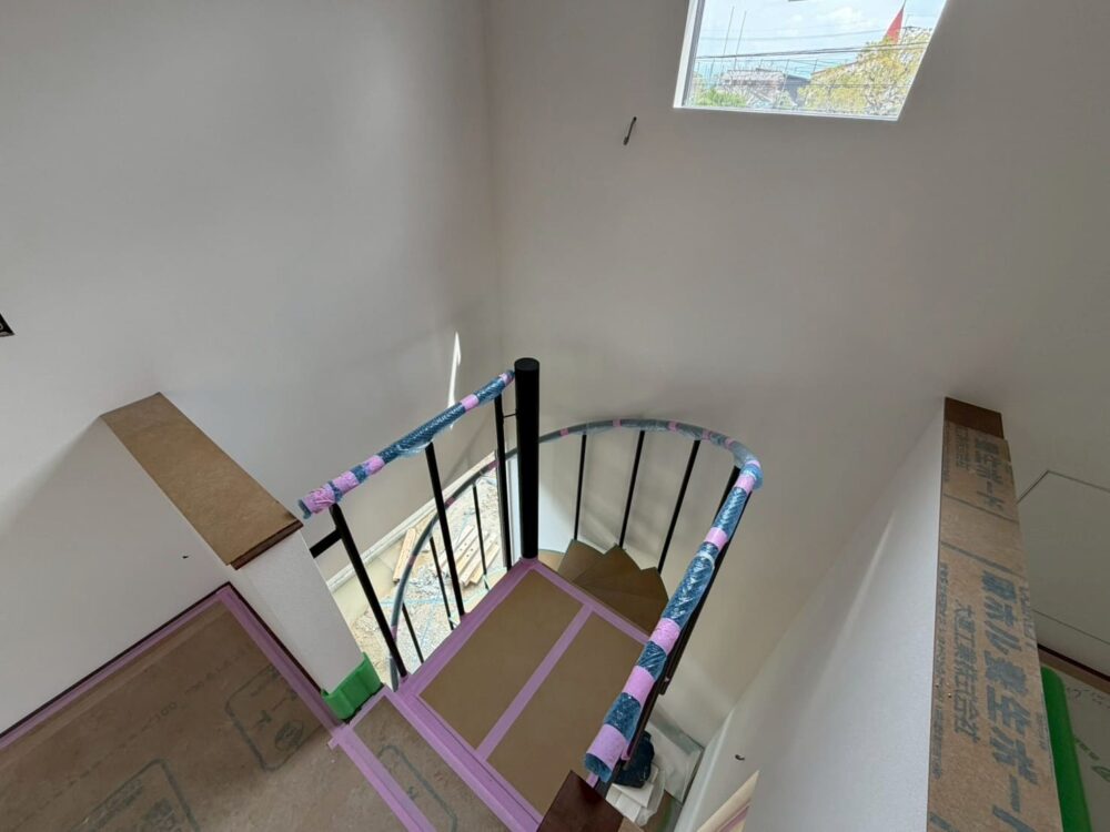 S様邸では螺旋(らせん)階段を採用しています。こちらは二階の階段入口からの様子です。