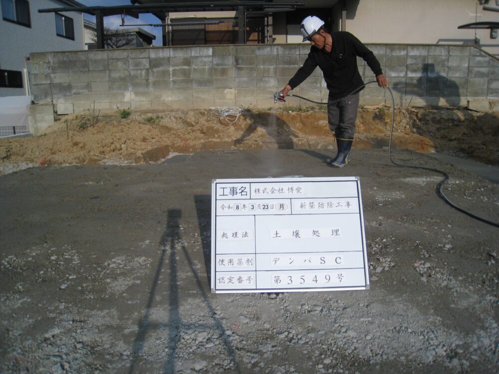 まずは、家を建てる前の地面に薬剤を散布し地中からシロアリが建物に侵入するのを防ぐ「土壌処理」をおこないました。