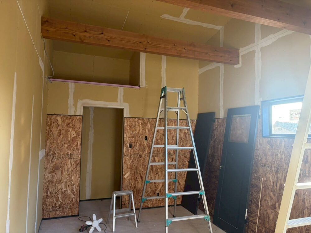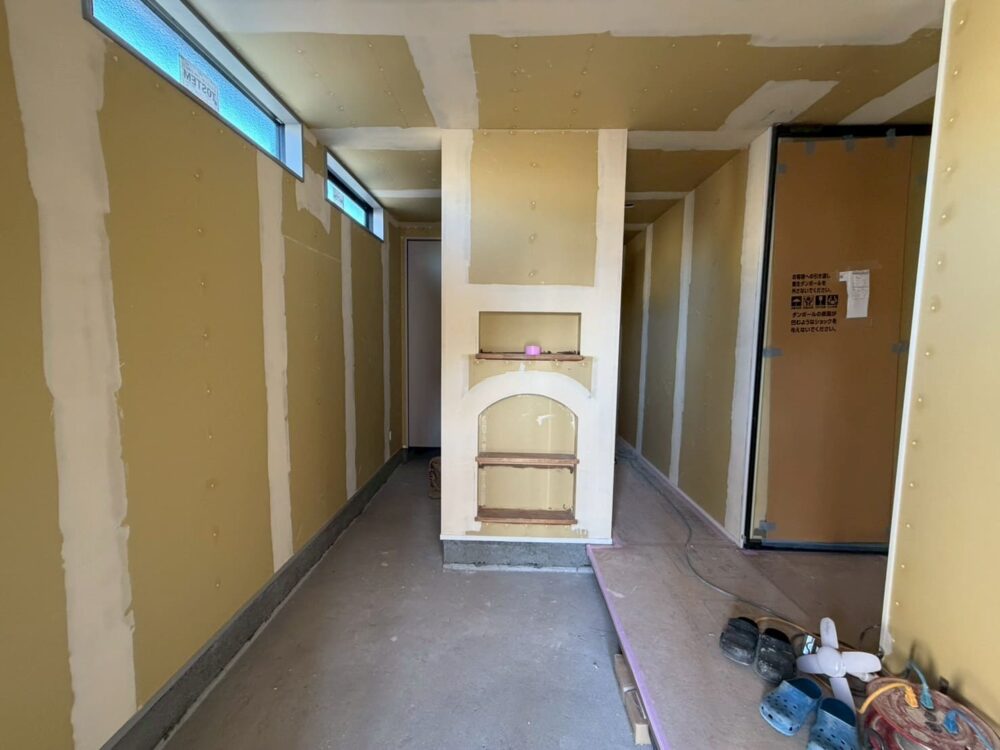 こちらは壁の上部と下部を異なる素材で仕上げる内装になります。上部はクロスを張るための下処理をおこないます。