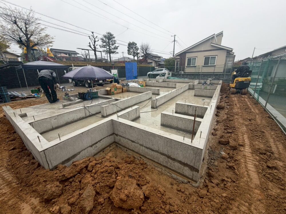 基礎の立ち上がりは柱や壁の位置に合わせて作られているので、型枠を外すと家の間取り(部屋の配置)がはっきり分かるようになります。