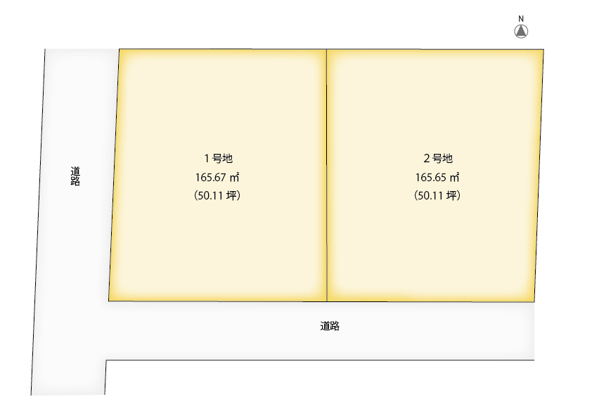 | 面積 | 1号地/165.67㎡(50.11坪)・済 2号地/165.65㎡(50.11坪)・済 |