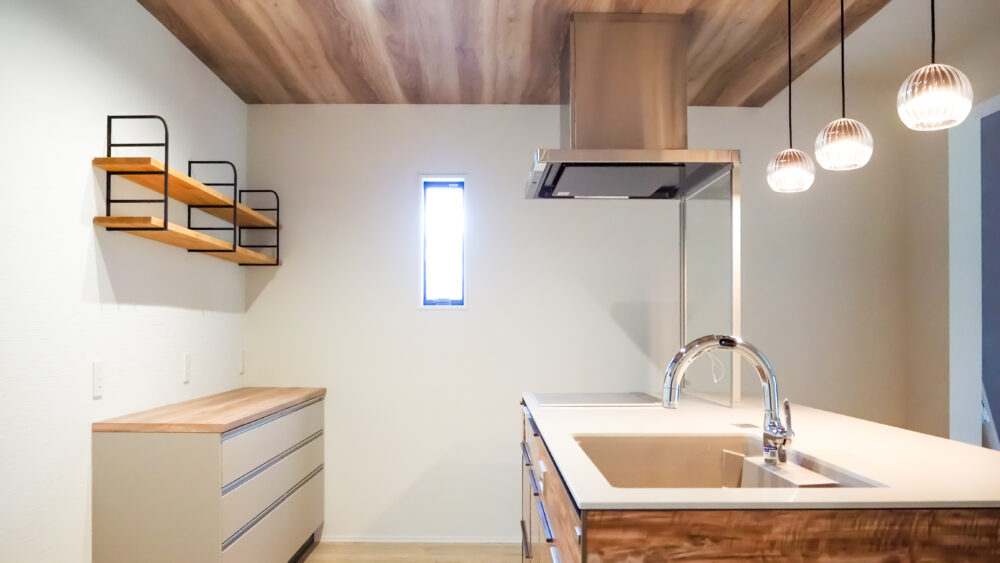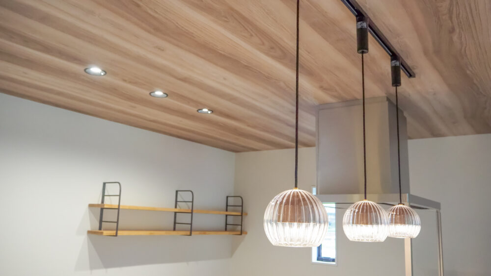 天井高を変えて木目にすることでアクセント。天井吊り下げ照明と造作棚を付けました。