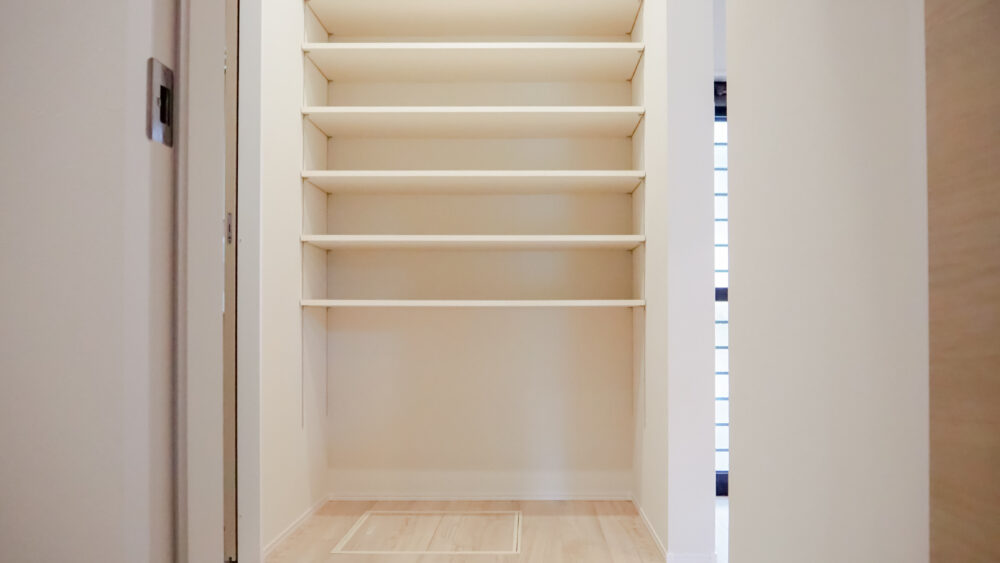 キッチン横にパントリーを設けることでキッチンをスッキリさせることに成功