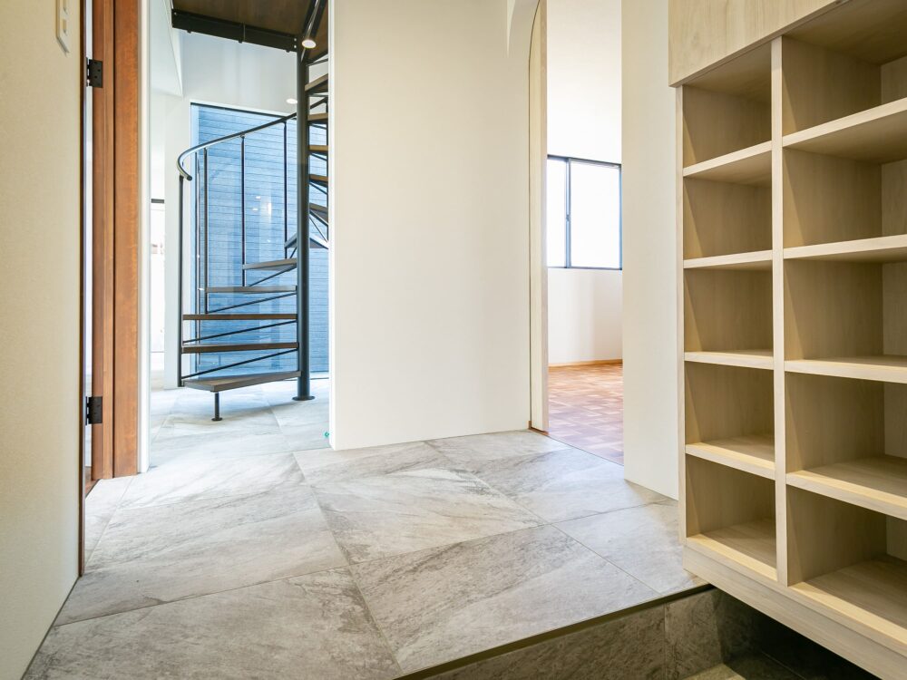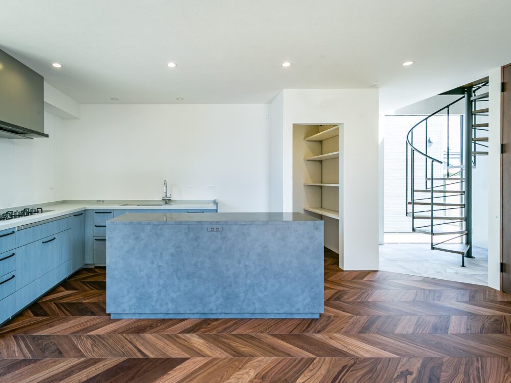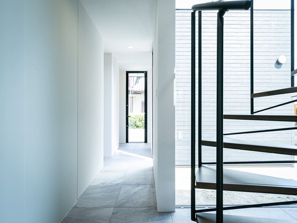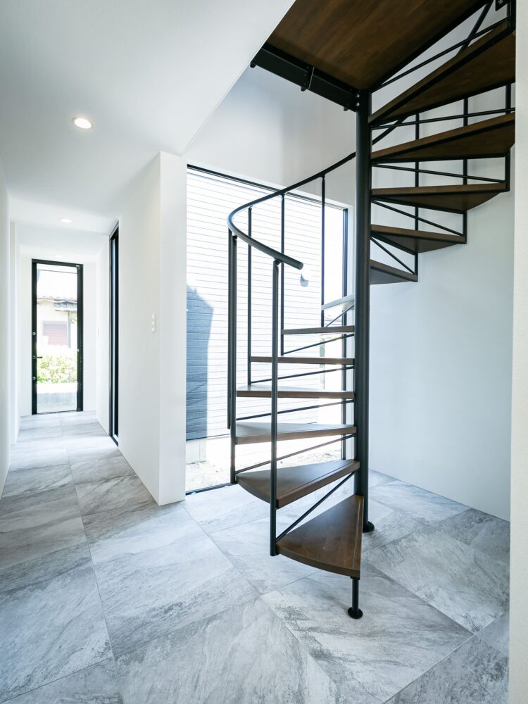 2階へ続く螺旋階段は、光を受けて美しく浮かび上がる印象的な存在。直線的な空間にやわらかな動きと、上質な雰囲気をつくる空間のアクセントとなります。