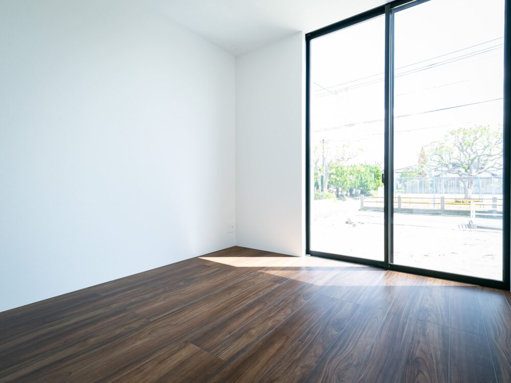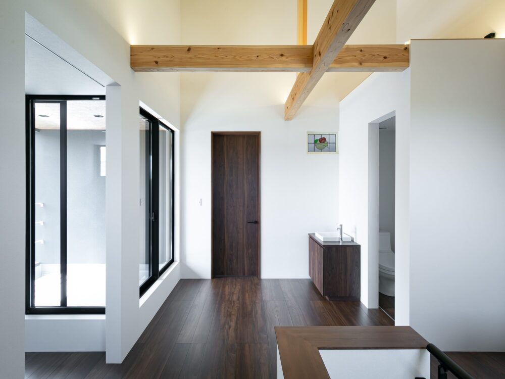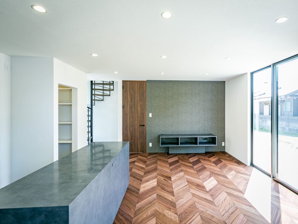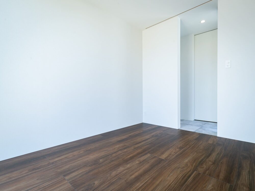 ドアを設けず、床材の切り替えでゆるやかに空間をつなぎました。斜めに配置した入口が、視線に奥行きを生み自然な広がりを感じさせます。