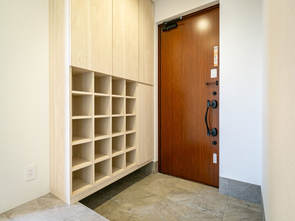 玄関を上がると、石調の床と木のぬくもりが調和し、奥へと続く空間が広がります。